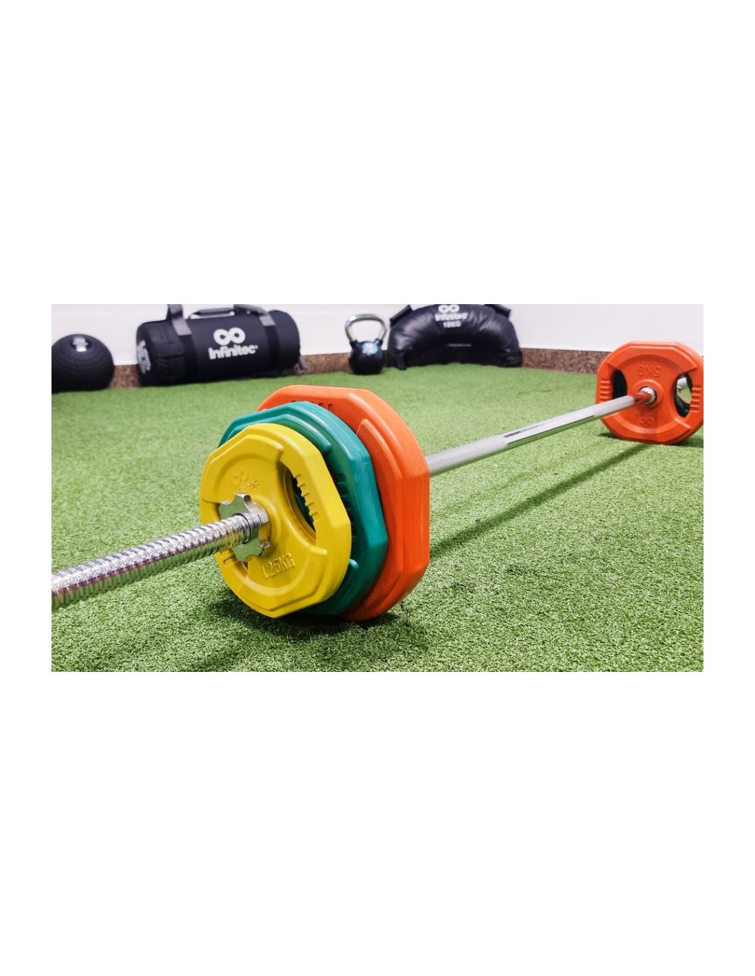 Formado por: 1 barra work power, 2 discos de 1,25 kg, 2 discos de 2,5 kg y 2 discos de 5 kg de caucho.